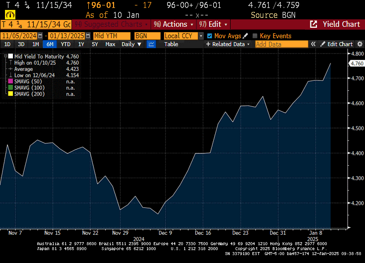 US equity markets fell in the first full week of 2025 as investors recalibrated their Federal Reserve monetary policy expectations. Stronger labor data, a robust ISM Services print, and a weaker Consumer Sentiment report showing increased inflation expectations fueled losses across the US yield curve, where the 30-year yield eclipsed 5%. Swaps markets now have only one twenty-five basis point cut priced in for 2025. Trump’s suggestion that he would utilize an Economic Emergency declaration to impose tariffs stoked the inflation narrative. Trump also suggested strong sanction enforcement on Russian oil and those entities that ship the crude oil, which sent oil prices higher by 3%. The Fed’s December meeting minutes reinforced the idea that the Fed was in wait-and-see mode, with the next cut now expected to come in the second half of the year. The yield on the US 10-year has increased by over 100 basis points since the Federal Reserve started cutting rates in September, which is unusual in a rate-cutting cycle and has brought in concerns about where equity markets are headed.